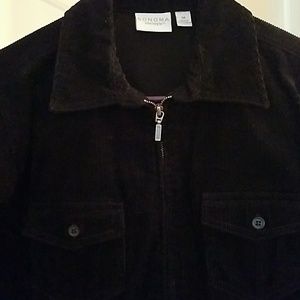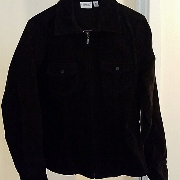 Black corduroy with zipper two front button pockets. 23" long from shoulder, 18" from pit to pit.