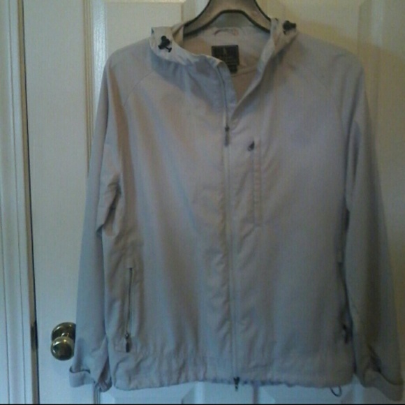 Tan hooded light weight jacket. Velcro cuffs, 3 pockets, under arm air holes. Size is a small, but seems more like a size medium.