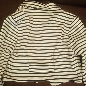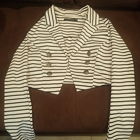 Black and white short-waisted jacket with long sleeves. Not lined. Polyester/Spandex. This is a Juniors size M. Worn 2-3 times. NO stains, snags or runs. Non-smoking, no pet environment.