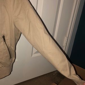 A tan cropped, bomber looking jacket. It has never been worn and is in great condition with no stains, just a little m bit winkled.