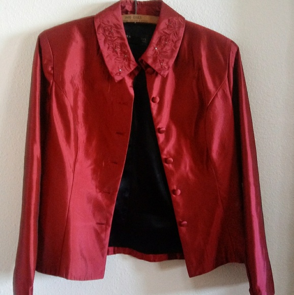 100% Acetate deep red womens blazer with beautiful embroidery on the collar, perfect for a special occassion!