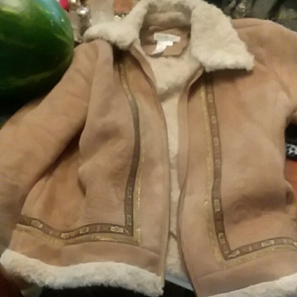 It's tan with embroidered seems acrylic 25% polyester 75% seems have stitching and is in very good condition