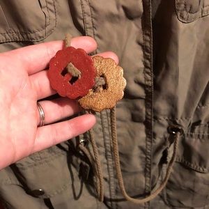 Sage green jacket with zip front and snap front closure. Large collar and snap up sleeve option.