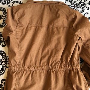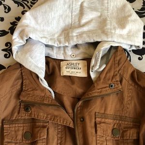 Super cute brown jacket with a regular size fit. Gently used, but in good condition. Has a removable hoodie. Eager to sell as all the earnings from my closet will go towards my college tuition., so thank you in advance for stopping by💕