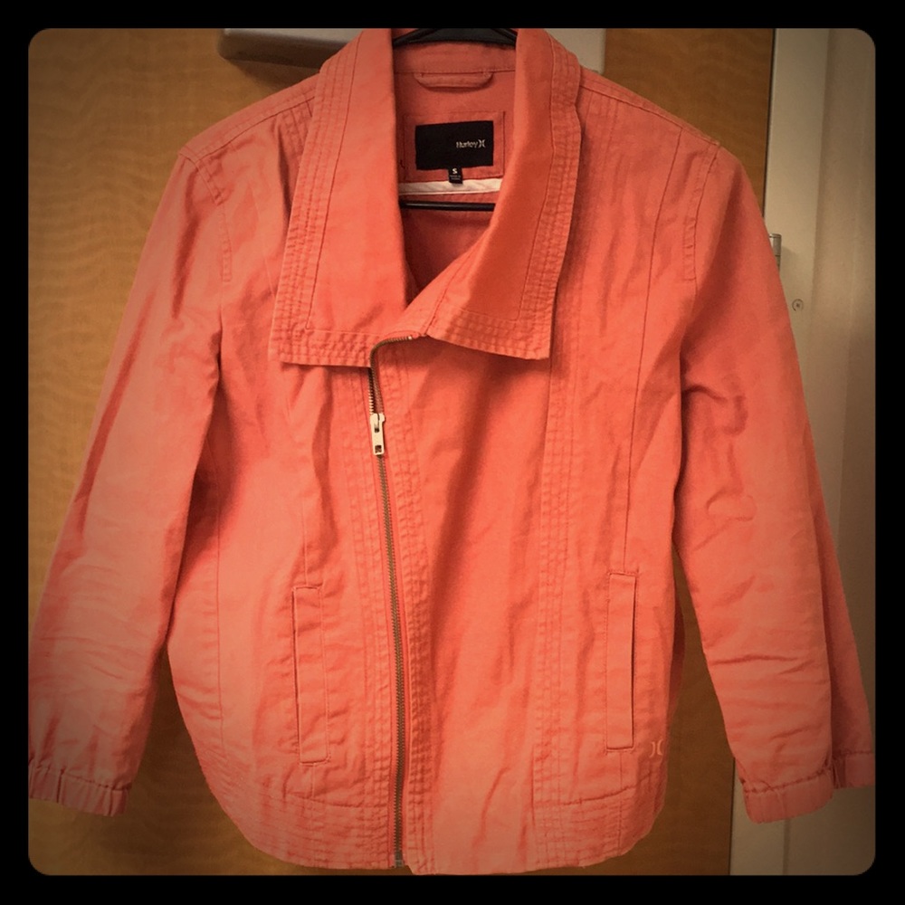 Copper pink Hurley jacket. The front is a little longer than the back and the sleeves are 3/4 long. No rips or stains, very chic. Material is like a jean jacket.