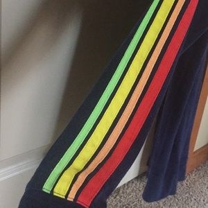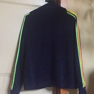 It has red, orange, yellow and lime stripes going down the arms the jacket itself is a dark blue/ navy.