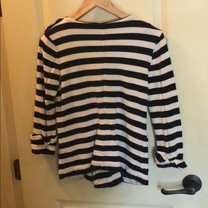 It’s a white and navy blue striped jacket with 8 buttons in the middle