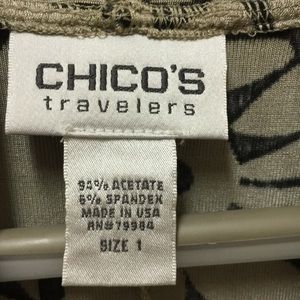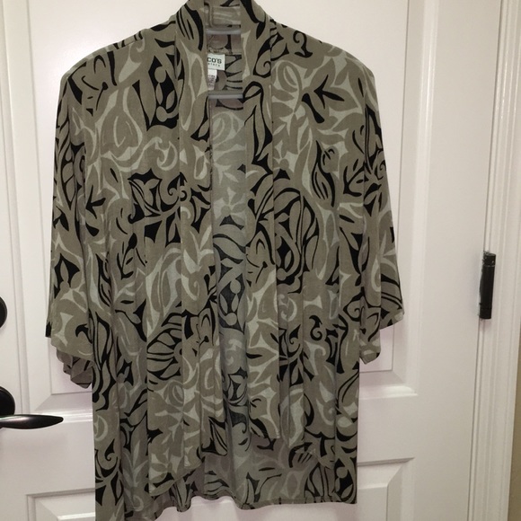 Chico’s Traveler open swing jacket 3/4 sleeve. The colors are beige, black and white. Washable and packable.