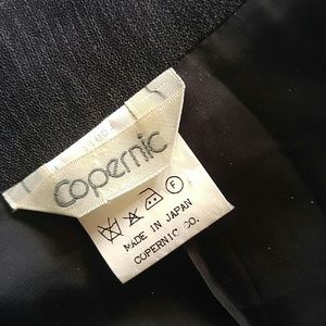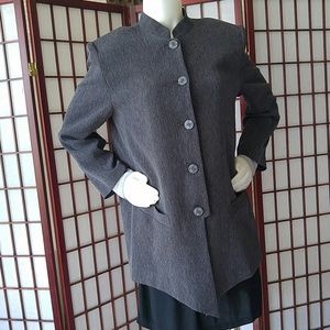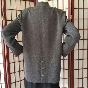 Jacket, Mandarin style collar jacket with shoulder pads, buttons down front, side pockets, longer diagonal design cut front, 9.5" back slit with decorative buttons, length 28"-31", gently worn excellent condition, 100% polyester shell and full lining