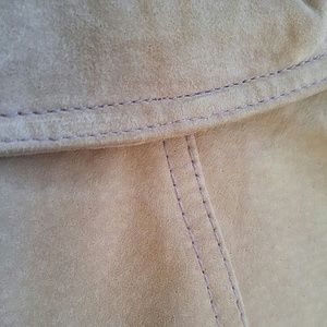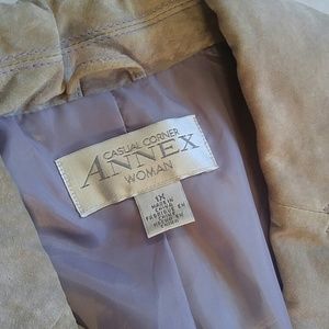Jaclet, 2 buttons down front, side pockets, length 25", armpit to armpit 25", gently worn good condition, shell 100% leather, full lining 100% polyester