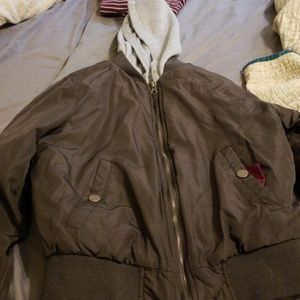 Army green jacket with gray hood can zip up the gray inside or both the green. And gray