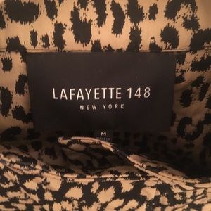 Animal print jacket with front covered placket, side pockets, long sleeve and stand up collar.