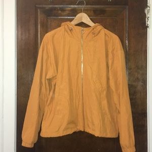 mustard yellow jacket with hoodie and mesh on inside. really cute and from forever 21! lmk if u want more info!