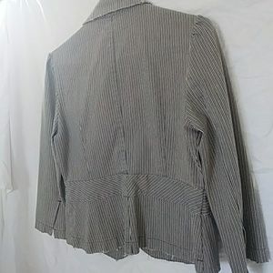 Blue, whiten, and grey striped with blue buttons; front pockets