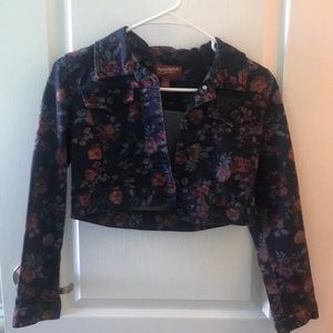Dark blue floral cropped jacket. Yes, It’s a JUNIOR SIZE 14/16! A petite adult can still wear this fashionable jacket.