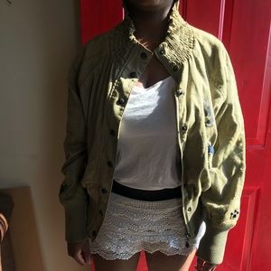 Green and Gold Jacket with black accent button with denim pocket detail.