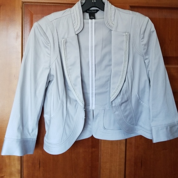 White house black market jacket. Size 8. Barely worn. Light gray with bead accent on lapel. 3/4 sleeve.