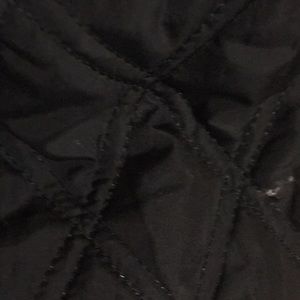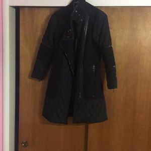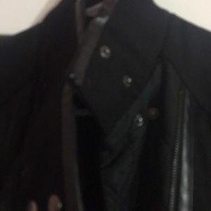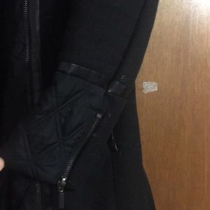 Unique black jacket/dress coat. Has quilting, suede, leather-trimmed pockets and zippered arms. Really retro looking. Great condition.