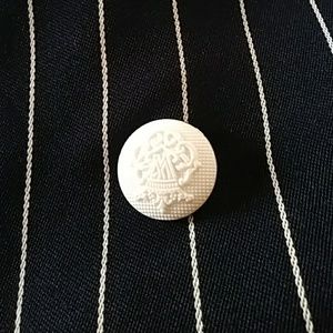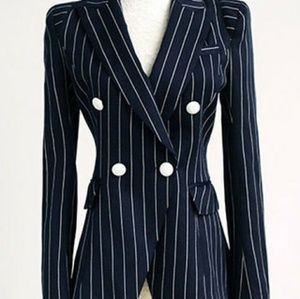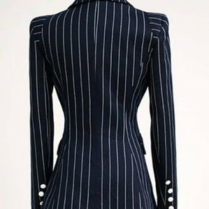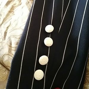 Good quality material. Navy with white stripes , double breast Jacket. Size S -M is true size.