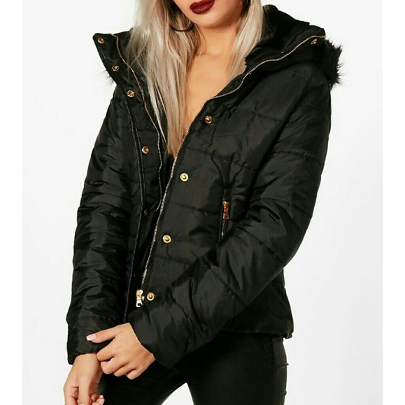 Christie Quilted Faux Fur Trim Jacket. Breathe life into your new season layering with the latest jacket from boohoo. Supersize your silhouette in a sporty padded black jacket.