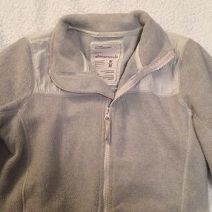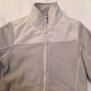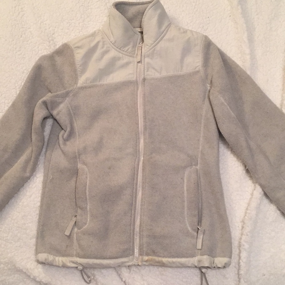 Comfy zip up jacket with turtle neck that can fold down. Fluffy, soft fabric on bottom half and faux leather type fabric on top half. Beige/cream color