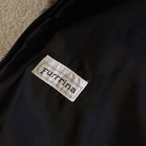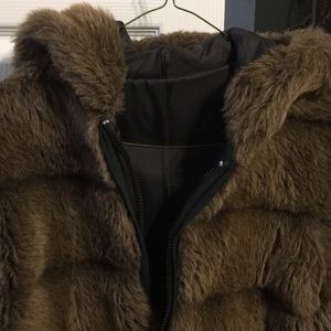 Faux fur Furrina brand zip front jacket with hood. Fits right below hip. Brown faux fur. Stripe look to it. Size small.