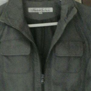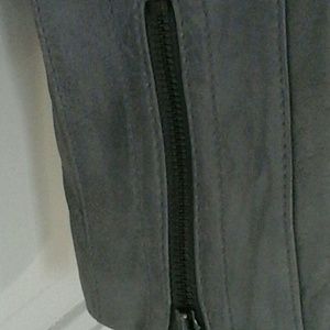 Leather jacket, grey. Front has 4 flap pockets & bottom pockets have slit openings on top of flaps. Jacket measures 21" long, sleeves are 24" long with a 5" zipper on the side of each sleeve. Professional dry clean