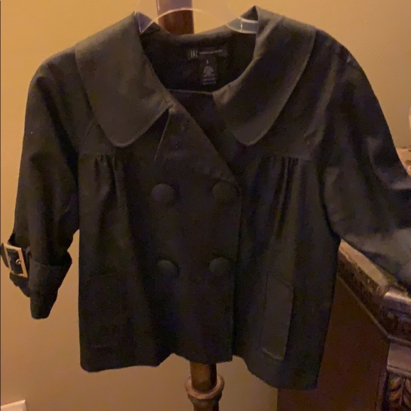 Gray jacket with a slight sparkle. Buckle on each sleeve and buckle in the back