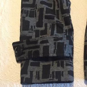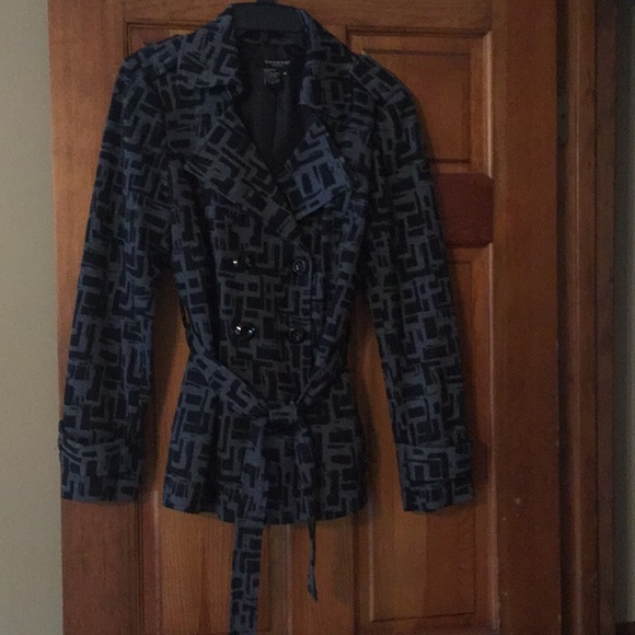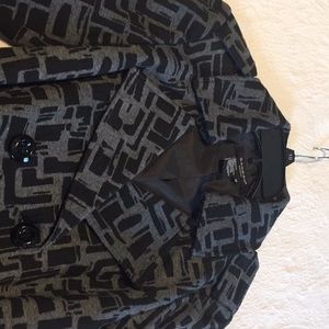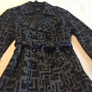 Very nice black and gray jacket. Geometric shapes print with large black buttons and belt. Fully lined. Looks really nice with black dress pants or could be casual with black jeans or leggings. Only worn a few times.