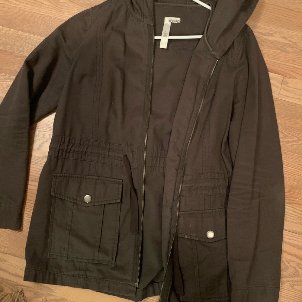 Green jacket, front pockets and hood. Jacket ties around waistline, Abound brand