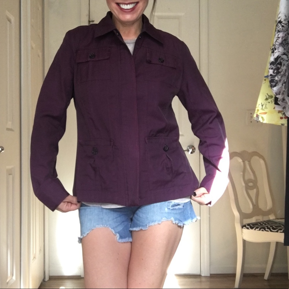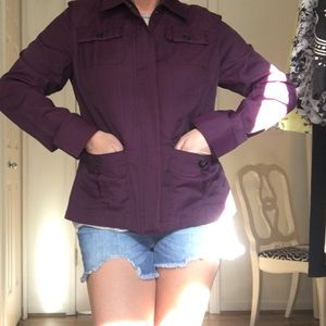 Plum colored jacket with zipper and pockets