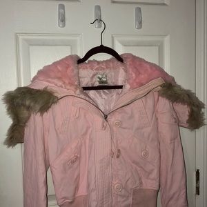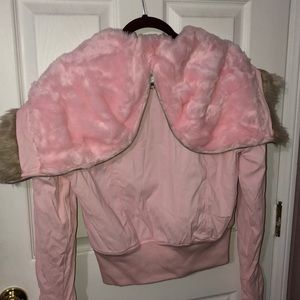 Really cute stylish pink jacket. The pink is a light baby pink