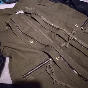 Army green black pleather sleeved jacket with sinched waist drawstring