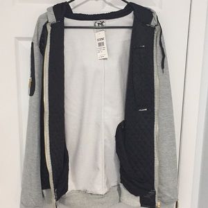 This is a grey and black jacket that is brand new with tag it has gold embellishments and faux gold zippers