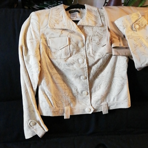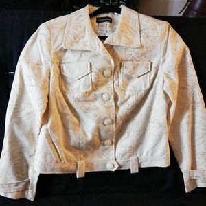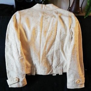 Jacket with belt loops at bottom. This jacket is cream color with gold glitter swirls going thru it.