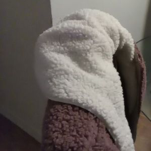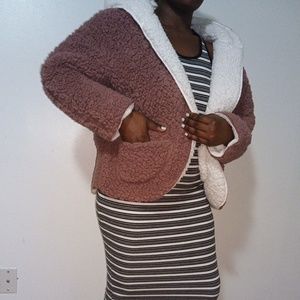 Cozy Soft material jacket two color, purple on the outside white on the inside, very very comfortable, keeps you warm for the cold weather, comes with a hoodie only worn once.