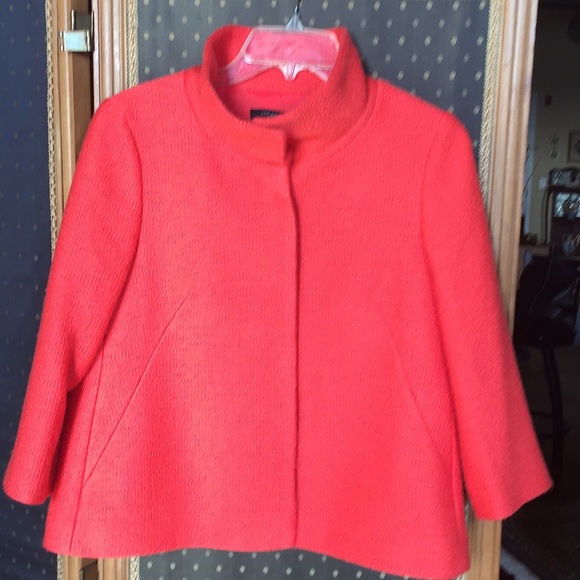 Ann Taylor wool jacket with 3/4 sleeves. Collar can be worn up or rolled. Hidden snaps. Color is coral. Size 6