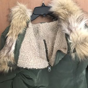 Olive jacket; faux Sherpa lining on hood with adjustable zipper; brass hardware