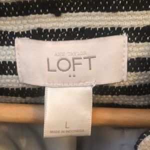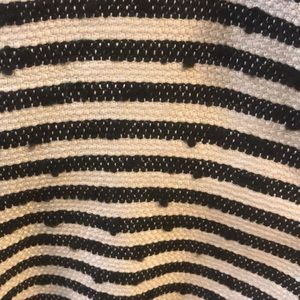 Fully lined black and off-white striped jacket with zippered front and 2 pockets. Nice detail in the shoulder. Material is a blend of acrylic, cotton and wool and has a knobby texture ( see pic). Pairs nicely with any color of slacks for a professional look.