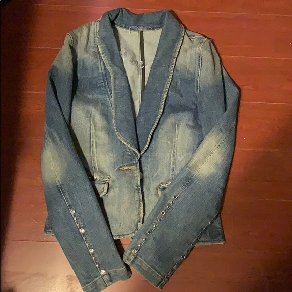 Marciano jean jacket distressed size medium but it runs small, so I would say it’s a small instead, like new