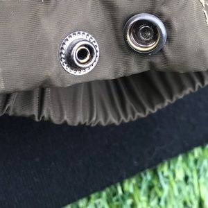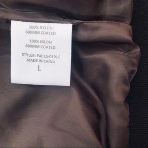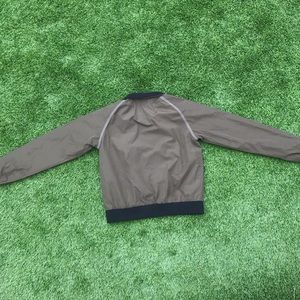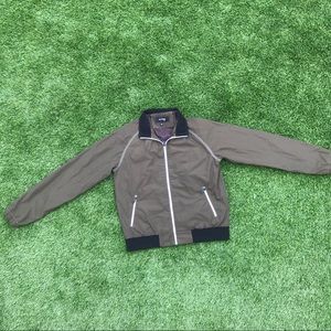 This a forest green windbreaker type jacket. It has two zippered pockets and a warm collar. Also has a concealed left side pocket near the chest.