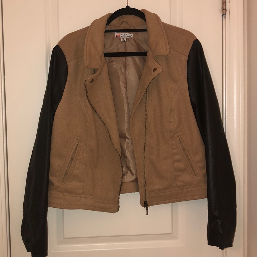 Tan with Black pleather sleeves Moto Jacket. Gently used.