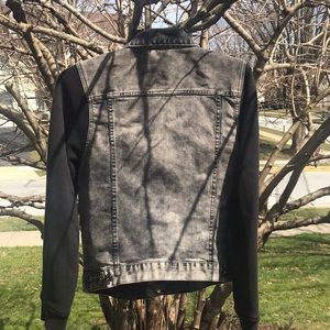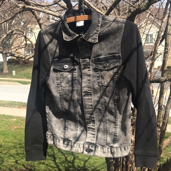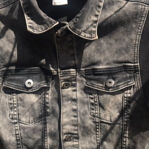 Adorable stone washed black denim jacket with cute button detail and cotton sleeves.
