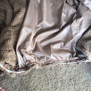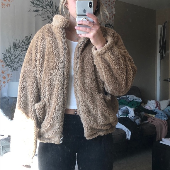 Tan Sherpa jacket. It’s a size L but fits like a medium. Offers welcome! It’s a great jacket, I don’t wear it anymore. The things are the bottom are from me trying to cut the seams out but it’s not noticeable.