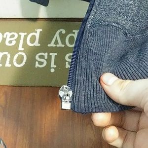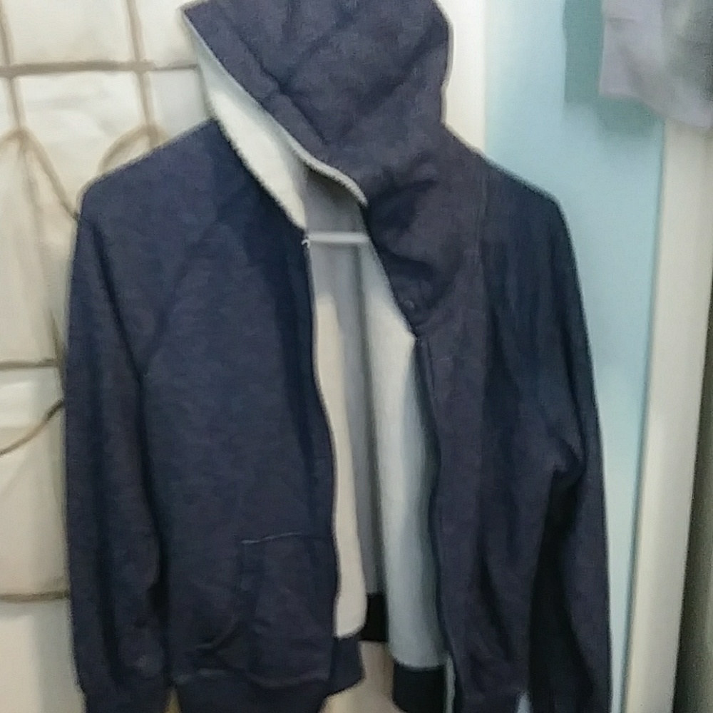 Navy blue with white fleece inside. Zipper is broken but that is the only thing wrong with it. No holes or rips. Very warm