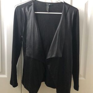 Front is non-leather; blend of polyester and spandex and hangs nicely