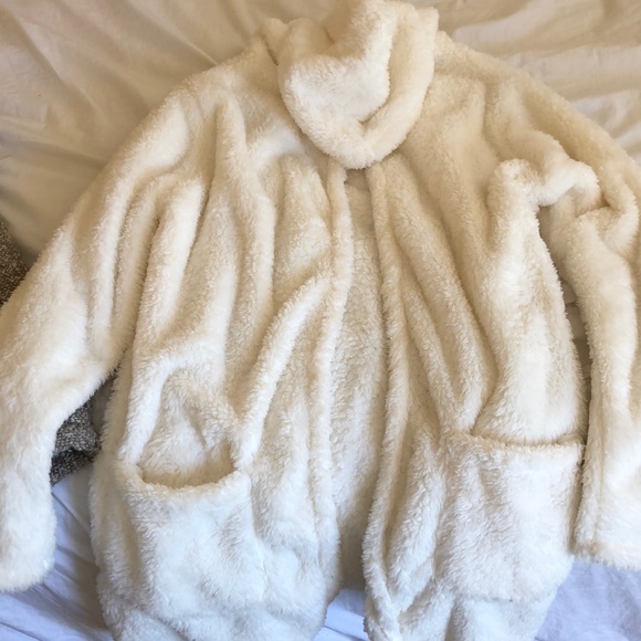 Cream jacket with pockets and a hood.