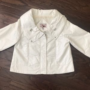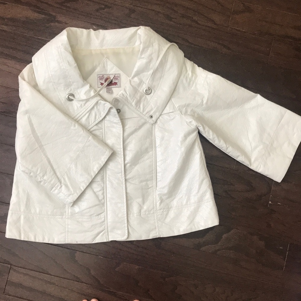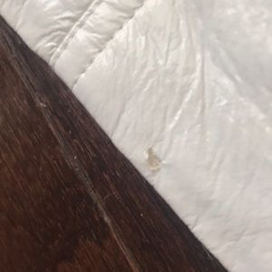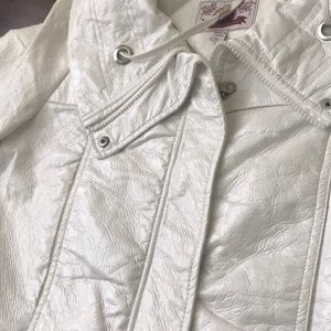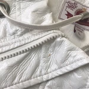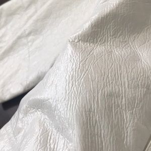 White shiny jacket has a really tiny mark on collar and a little piece scuffed at the bottom but really don’t notice it