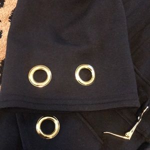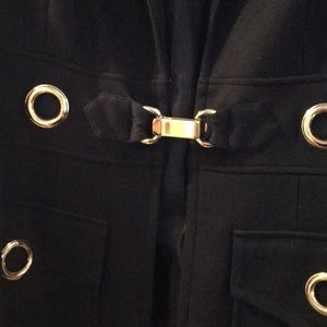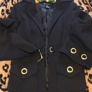 Very soft material black jacket ..rayon ,nylon spandex mix ..buckle closure .front pockets wide sleeve at the bottom