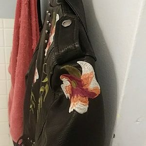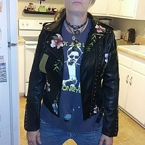 Black and floral design leather motorcycle style jacket. Brand new still with tags on it. Perfect condition. Just too small for me. It's a large but really more like a big small or small medium...great looking jacket however.